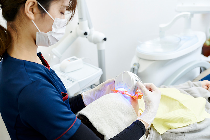 歯科医院にて高濃度の薬液を使用できることや、専用の光照射機を使って白さを促進する処置ができるので、歯を白くする即効性があることが特徴です。。
